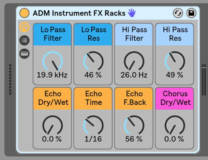 This is an Instrument Rack with effects ready to go. Just drop an instrument in the rack and you instantly have a Low and High Pass Filter, Echo, and Chorus.